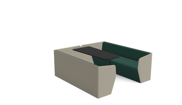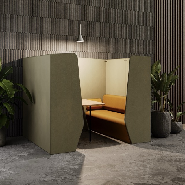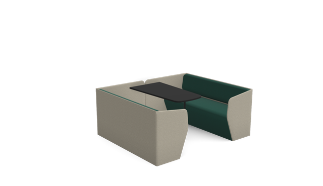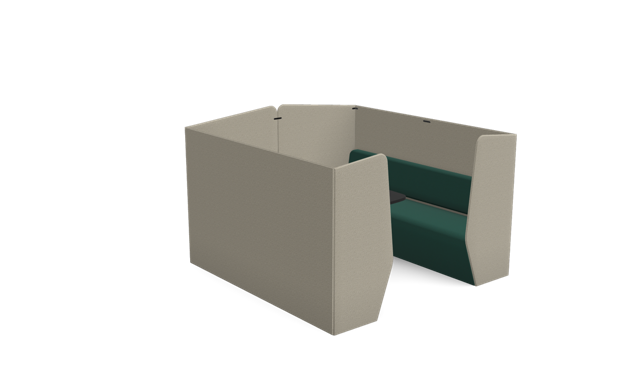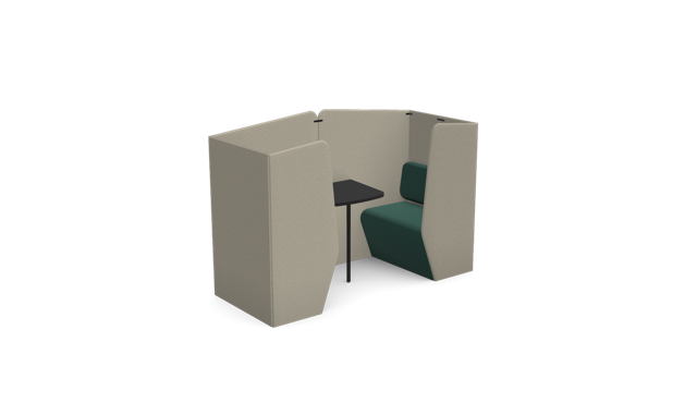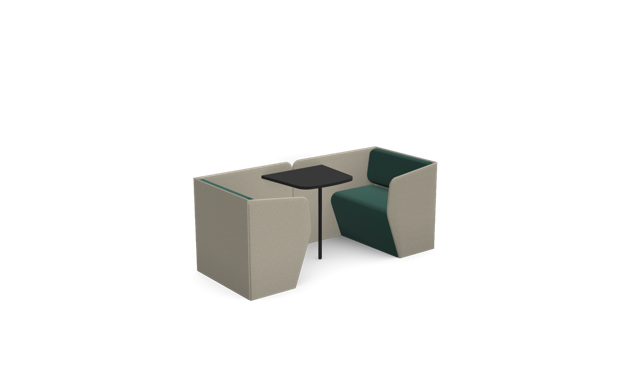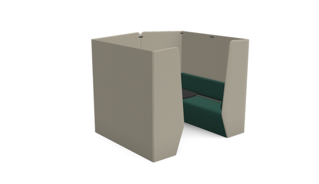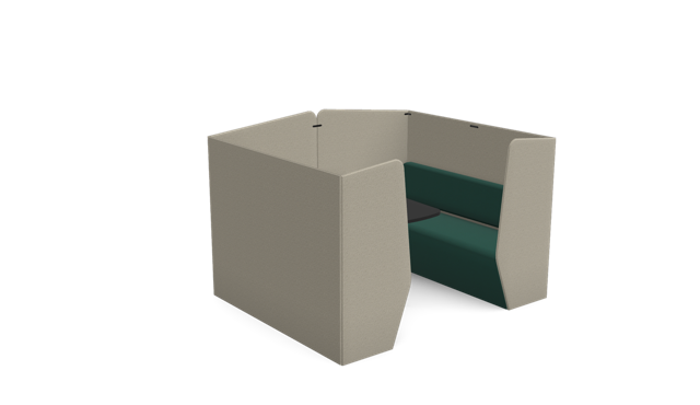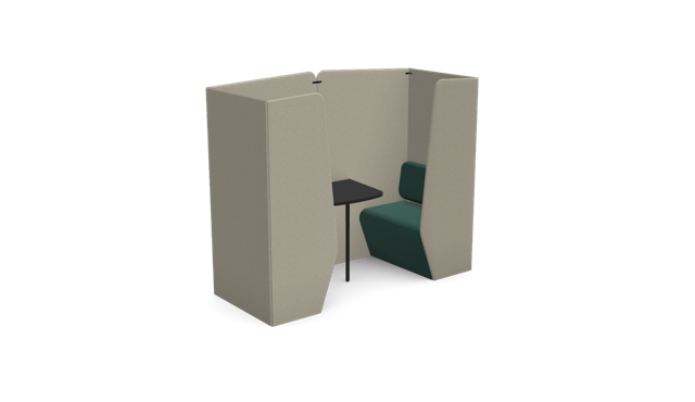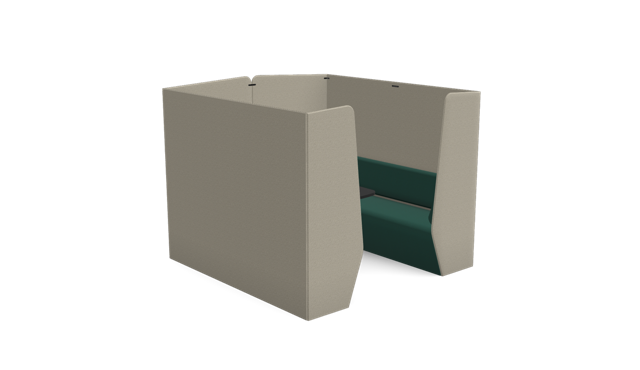 The Plats Booth creates enclosed meeting and work spaces by combining two Plats Seat units with connecting side panels and an integrated table top. Available in 2, 4, and 6-seater configurations across low, medium, and high back heights, offering privacy and functionality for collaborative work.